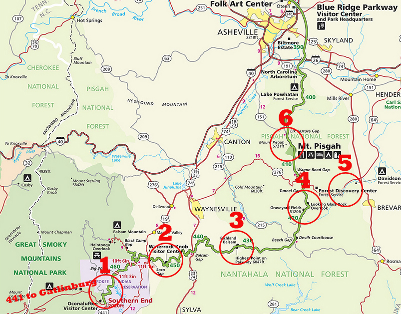 Was Clingman’s Dome on your list? Richland Balsam is the highest point on the Parkway and only 600 feet lower than the pinnacle at Clingman’s Dome. (If you’d like to drive a couple hours more, the Parkway skirts the side of Mount Mitchell, the highest point east of the Mississippi. Mount Mitchell has an observation deck similar to Clingman’s Dome.)
