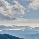 Clouds pool in the valleys viewed from Thunder Hill Overlook at Milepost 290 on the Blue Ridge Parkway near Boone, North Carolina.