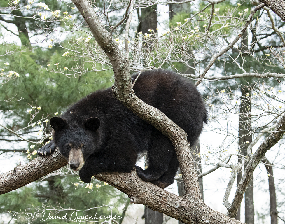 A black bear hanging out in a large dogwood tree during a late winter snow shower.
