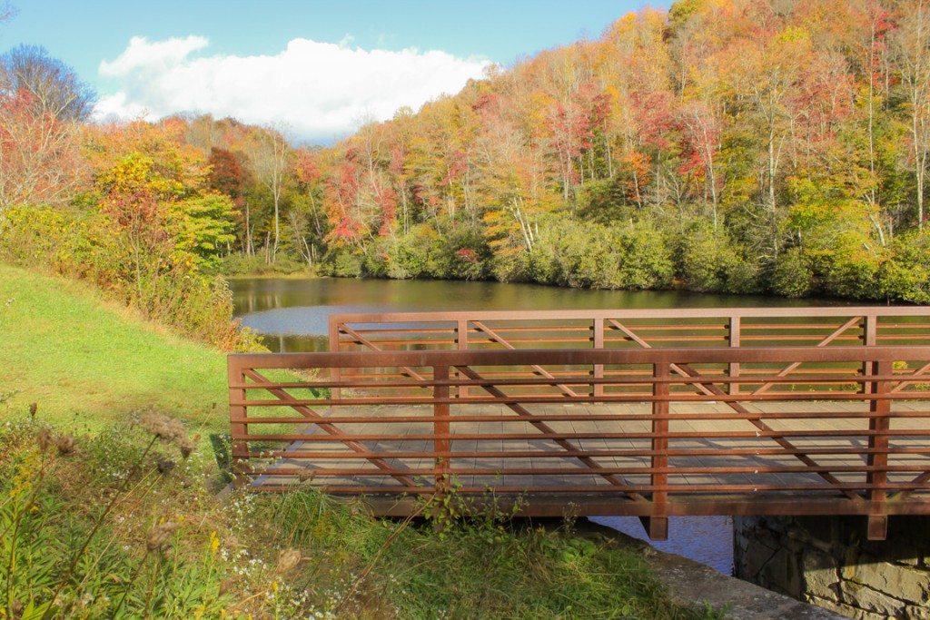 The trail begins on this bridge over Sims Pond. From Sims Pond Overlook, Milepost 295.9, you can walk around either side of the fence and down a short hill to reach this bridge.
