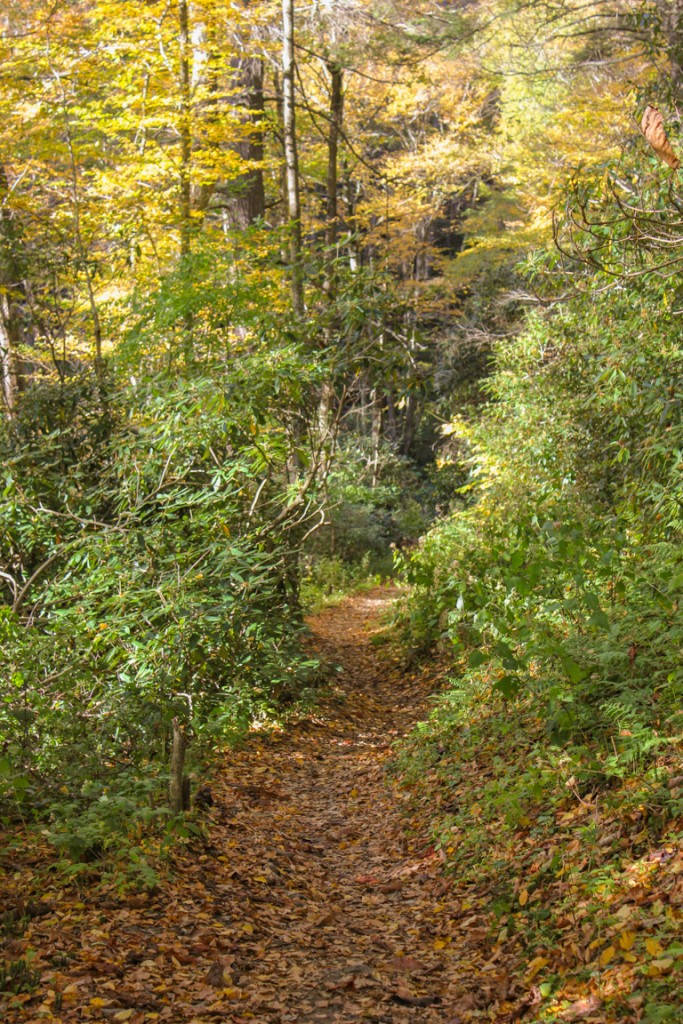 The first part of the trail winds through a grove of towering trees on a narrow rhododendron-lined pathway.