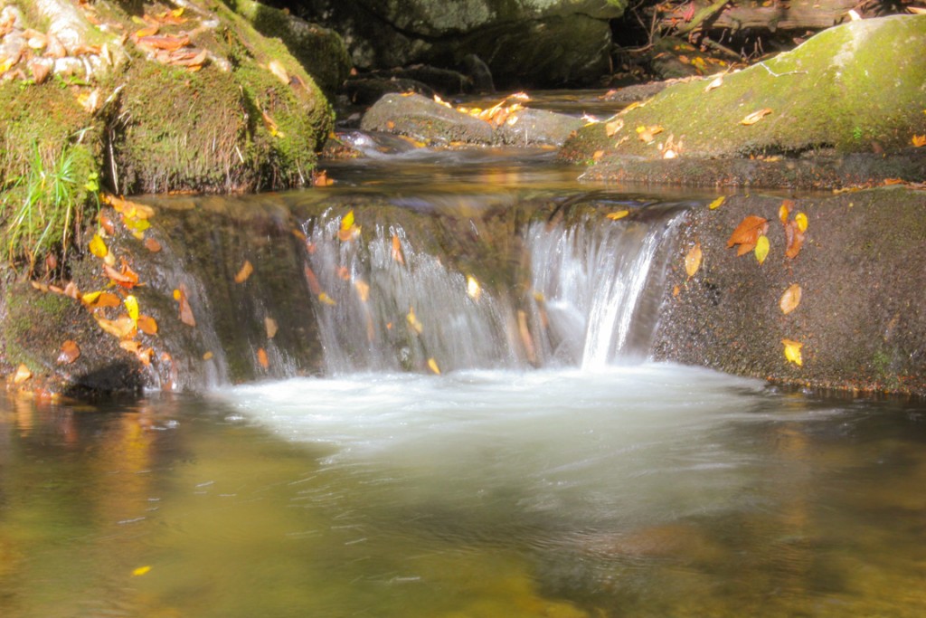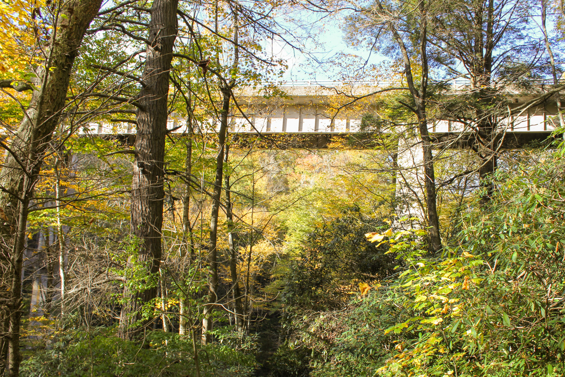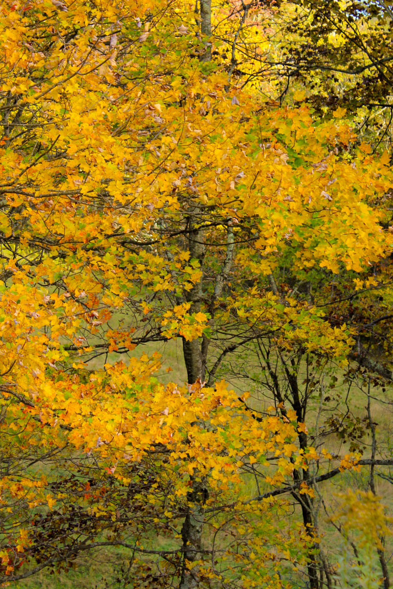 The Green Knob Trail is a 2.3-mile hike in Price Park that begins at Sims Pond Overlook and passes through woods, valleys, and meadows, over Sims Creek, under the Sims Creek Viaduct, and up to the 3,920′ Green Knob. The varied terrain makes this an excellent trail for tourists who want to see the many types of landscapes in the Blue Ridge Mountains. On October 11, 2015, the fall color was nearing peak.