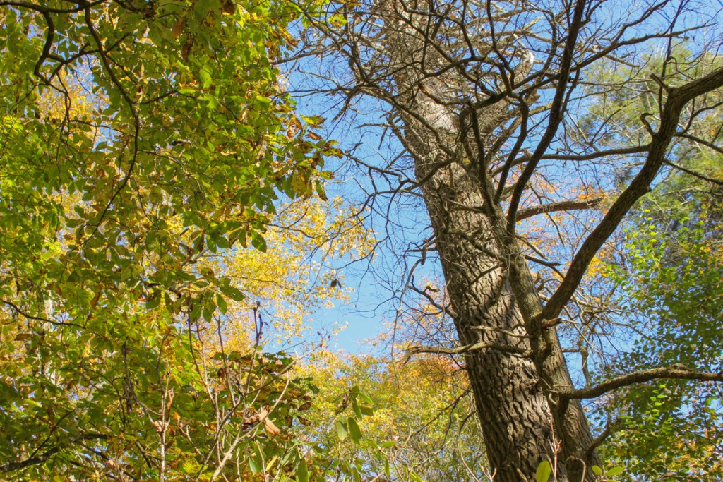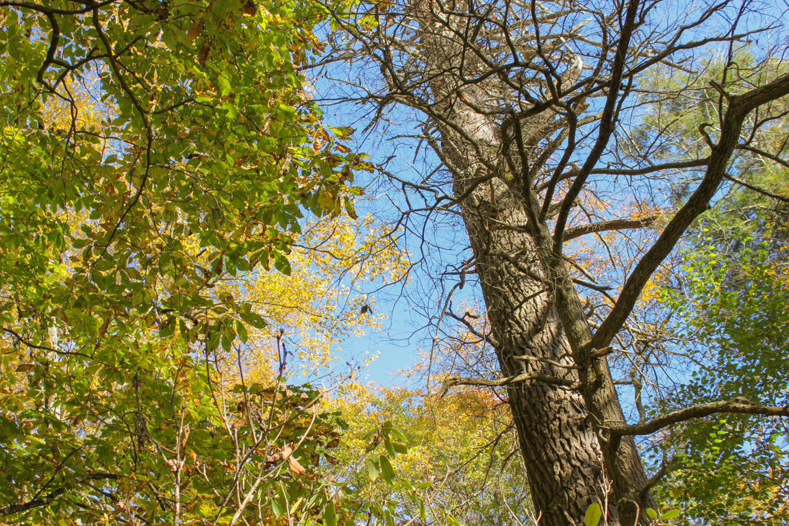 The first section of the trail passes through a grove of hemlock trees, so the damage to the hemlocks caused by the Wooly Adelgid is visible and severe.