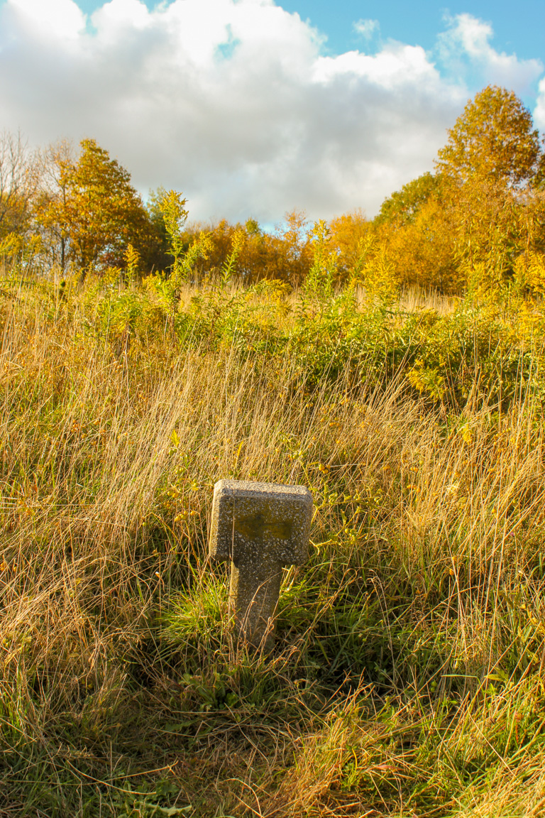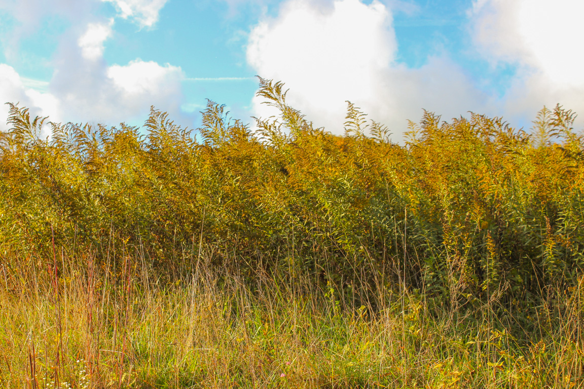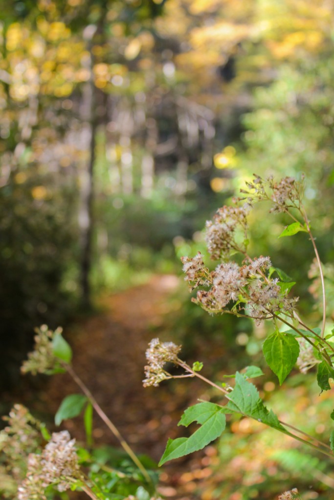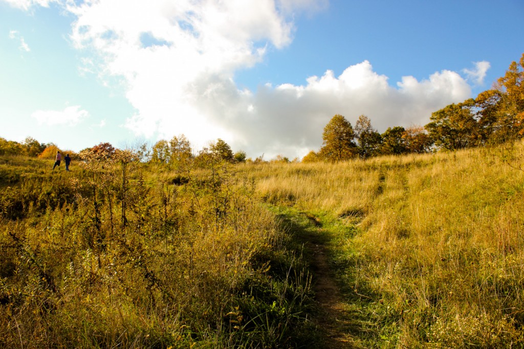 The trail briefly opens up onto a field of wildflowers. In fall, it is filled with blooming goldenrod.