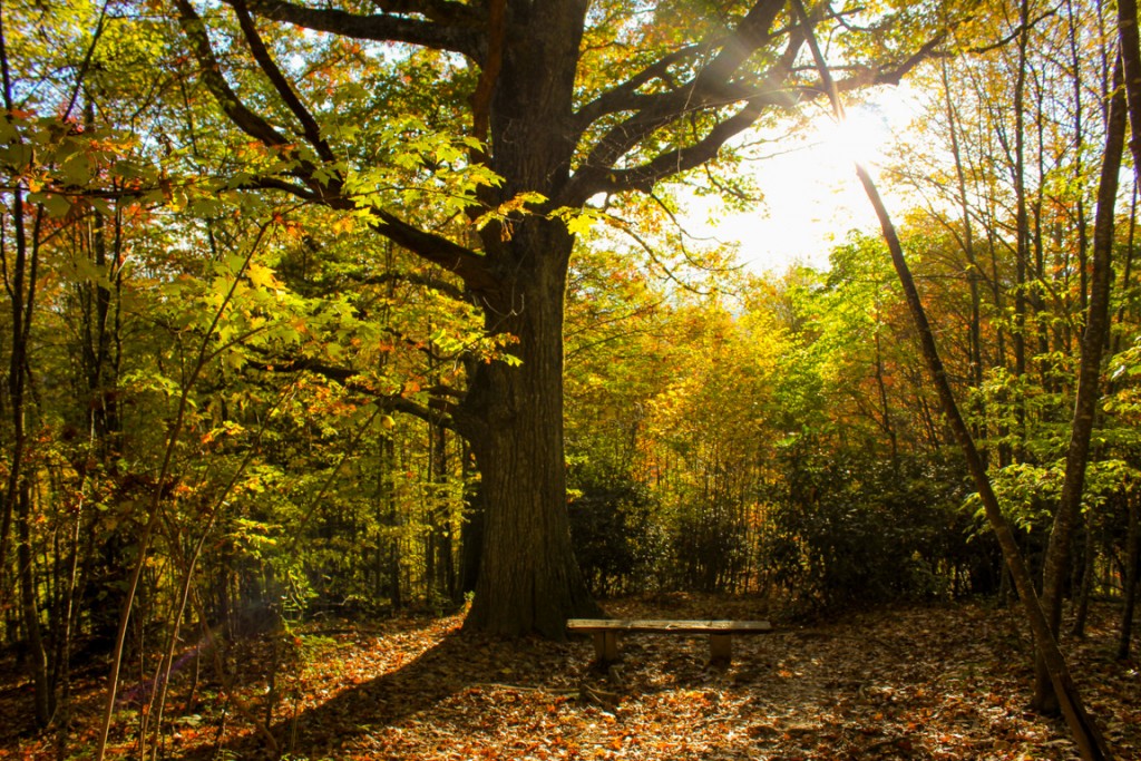 At the bottom of the hill is a bench under a magnificent oak tree.
