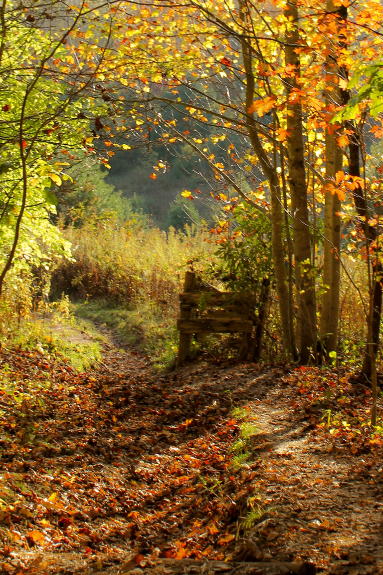 This tree, located at the center of the valley, turns vibrant red each year. There is a bench under it, just before the trail gets very steep to climb out of the valley.